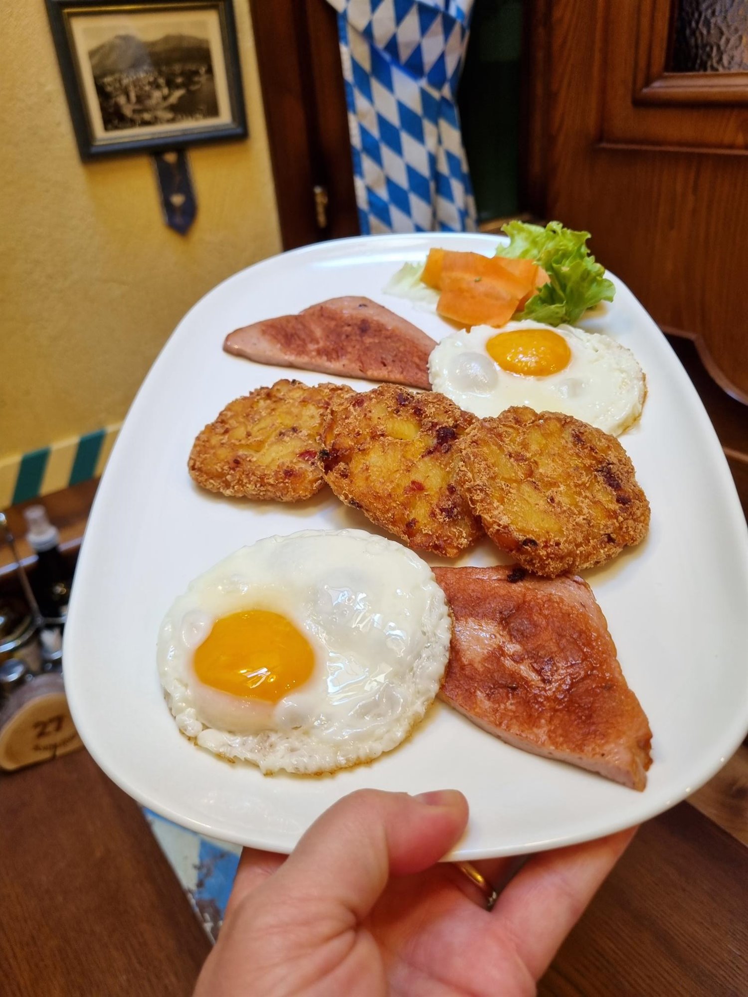 Sautéed potatoes, egg and bacon.